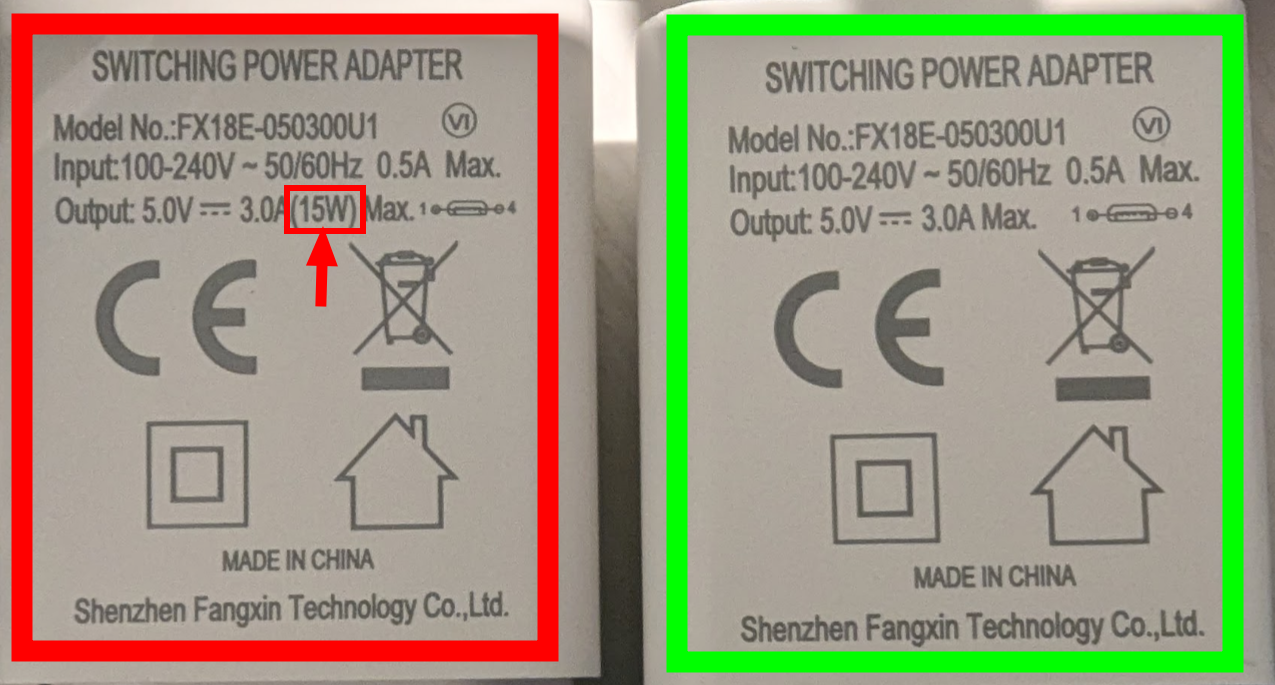 Das betroffene Netzteil (links) ist fast identisch mit dem funktionierenden, kann aber durch einen zusätzlichen "15W"-Text unterschieden werden, der beim funktionierenden Netzteil fehlt:
