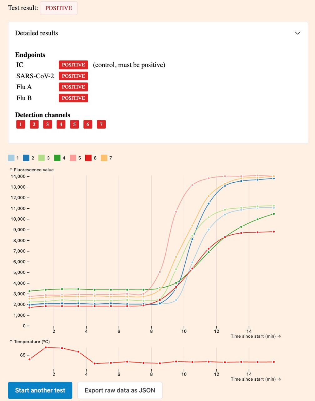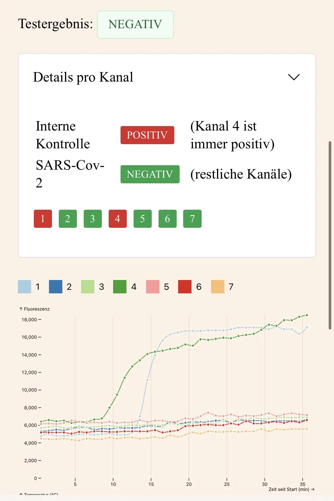 Keep the browser window and tab in the foreground during the test. Progress can be tracked in real time. If the test is negative, the control curve (channel 4) will increase exponentially after approx. 10 minutes, while the other curves will not change at all or only slightly. If the result is positive, several other curves will rise in addition to the control.