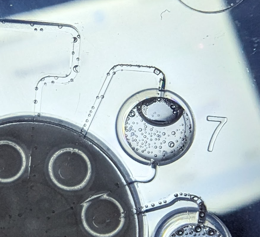 Make sure that the chambers are fully filled with liquid. Very small air bubbles tend to be OK, but large air bubbles will cause problems (see above for an example of an air bubble).